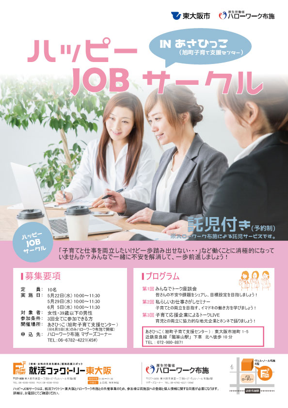 事前予約が必要となります。電話またはハローワーク布施マザーズコーナー窓口にてご予約願います。